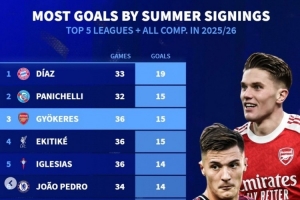 本赛季五大联赛新援各项赛事总进球榜: