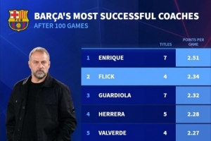 体育资讯3月3日讯 德国转会市场统计了各教练执教巴萨前100场的场均积分,并列出榜单,恩里克2.51分居首,弗里克2.34分次席。