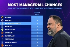 体育资讯2月12日讯 诺丁汉森林官方宣布,主帅戴奇下课。德国转会市场统计了诺丁汉森林2022-2023赛季开始征战英超以来,英超各队的换帅人数,狼队7人最多,切尔西6人第二,诺丁汉森林4人并列第三,即将任命第5位主帅。