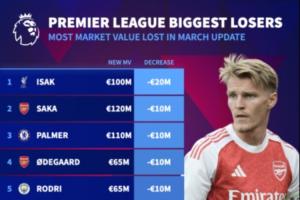 体育资讯03月09日讯 德转今日更新英超身价。在英超跌幅榜上,伊萨克暴跌2000万欧居榜首,萨卡、厄德高等8人跌1000万欧。