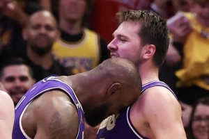 谈到本场队友东契奇拿下40分准三双以及连进关键球,詹姆斯说:“他整个赛季都是这么为我们打球的。过去一年里他都处于极佳的节奏之中,自从赛季开始就是如此。我们就是努力支持他,在防线后方支援他,当他突破时做好准备,做好接球就投的准备,积极从后方空切。不过,他自己打进了多记关键球,那记左侧翼的后撤步三分真是关键,太强了。”