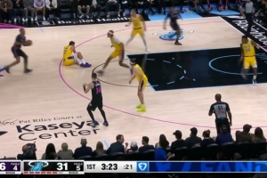 GIF-镜头过来东契奇倒在地上,鲍威尔上篮命中,湖人暂停,东契奇一瘸一拐的