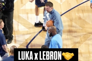 ESPN洛杉矶分部官方Instagram晒出一段比赛期间的花絮:湖人队友詹姆斯和东契奇在场边闲聊,詹姆斯还笑着推了东契奇一把。
