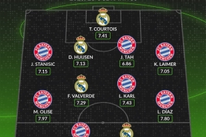 中场:奥利塞(拜仁,7.97分)、巴尔韦德(皇马,7.29分)、卡尔(拜仁,7.43分)、迪亚斯(拜仁,7.80分)