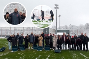 慕尼黑地区近日强降雪,导致拜仁训练基地积雪严重,俱乐部工作人员清理训练场的积雪,确保球队正常训练,孔帕尼与工作人员合影,对他们表示感谢。