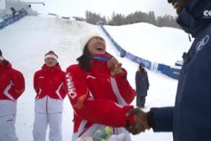 赛后颁奖仪式上,徐梦桃笑着用英语向颁奖嘉宾调侃:这是我的第一枚奥运会铜牌。